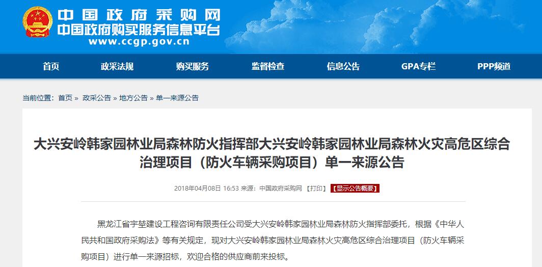 據(jù)林業(yè)局領(lǐng)導(dǎo)介紹,該批車輛到達(dá)林業(yè)局后下發(fā)至林業(yè)局防火辦,主要用于森林滅火人員物資輸送,后勤保障救援,防火器材運輸?shù)戎饕ぷ,因此對車輛的質(zhì)量要求極其嚴(yán)格,對我們公司提供的防火車輛給出高度評價,此批車輛為韓家園林業(yè)局經(jīng)過層層篩選,反復(fù)招投標(biāo)后才確定的車型,公司接到中標(biāo)通知書時也是很激動,能接上這樣的森林防火設(shè)備運輸車,也對我們的服務(wù),質(zhì)量提出更高的要求。該局領(lǐng)導(dǎo)介紹由于林區(qū)防火公路多為簡易道路,對車輛通過性要求很高,我公司提供的四驅(qū)越野卡車能夠滿足他們的需求。下圖為招標(biāo)公示。