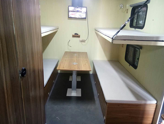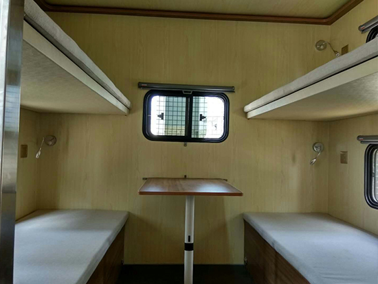 3、休息區(qū)備有4個上下鋪,配有床墊,每個上下床鋪依靠的墻壁上都有一個風景透氣窗。每個床鋪下面設一組附件柜,床位兩側上方各配衣帽鉤、插座和可調節(jié)床頭燈,休息區(qū)配有19寸液晶電視一臺及空調一部。