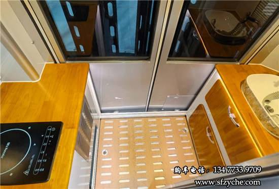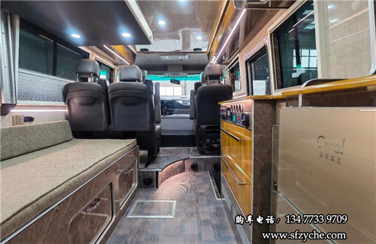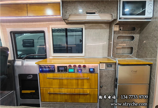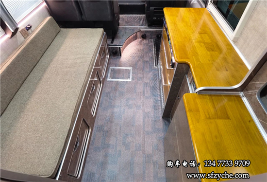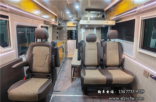得益于方正的車身,車內(nèi)空間非常寬敞,內(nèi)寬可達(dá)2米。布局方面從前往后依次是駕駛區(qū)、乘坐區(qū)、生活區(qū)和尾部的廚衛(wèi)區(qū)域。整車核載5人,車廂中部采用2+1座椅布局,全部帶有扶手和頭枕,乘客座椅全部朝前設(shè)計,增加了乘坐的舒適度。