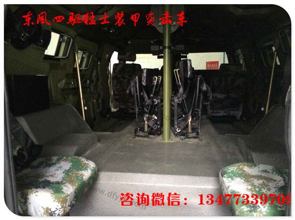猛士裝甲內(nèi)飾:同樣受保密制度限制,沒有第一時(shí)間得到猛士裝甲版內(nèi)飾照片,與猛士基礎(chǔ)車型相仿,因?yàn)橹兄靡妫噧?nèi)中央通道前部被發(fā)動(dòng)機(jī)所占據(jù),后排座的中央通道形成一個(gè)平臺(tái),可放置貨品或?yàn)檐図斘淦骰咎峁┤藛T操作平臺(tái)。請(qǐng)注意上下兩幅圖的猛士裝甲版車門內(nèi)側(cè)特寫的不同。