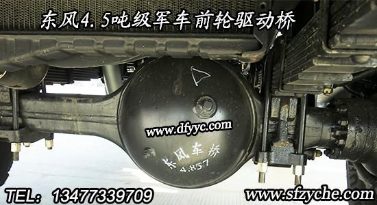 東風(fēng)六驅(qū)平頭軍車前橋采用東風(fēng)德納4.5噸級(jí)前置驅(qū)動(dòng)車橋,這種采用三肖式等速萬向節(jié)式的軍用驅(qū)動(dòng)前橋主要用于以下車型:早期的東風(fēng)3.5噸級(jí)六驅(qū)尖頭軍車EQ245、EQ2100E、EQ2100E6D等三種尖頭六驅(qū)軍車,后期主要應(yīng)用在東風(fēng)平頭軍車:EQ2102、EQ2162、DFS5160TSML型六驅(qū)軍車上。