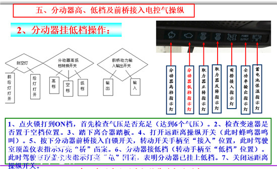 1、點火鎖打到ON檔,首先檢查氣壓是否充足(達(dá)到6個氣壓)。2、檢查變速器是否置于空檔位置。3、踏下離合器踏板。4、打開遠(yuǎn)距離操縱開關(guān)(此時蜂鳴器鳴叫)。5、按下分動器前橋接入自鎖開關(guān),轉(zhuǎn)動開關(guān)手柄至“接入”位置,此時駕駛室頂蓋儀表指示燈亮“橋”圖案。6、分動器接低檔(轉(zhuǎn)動手柄至“低檔”位置)。此時駕駛室頂蓋儀表指示燈亮“龜”圖案,表明分動器已掛上低檔。7、關(guān)閉遠(yuǎn)距離操縱開關(guān)。