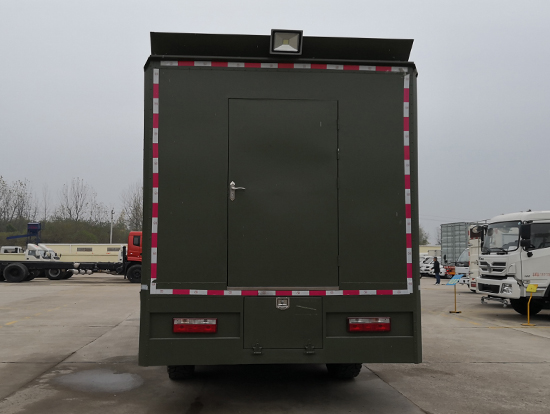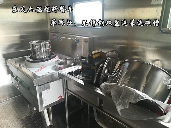 東風(fēng)六驅(qū)越野餐車車輛概述:采用東風(fēng)國五越野底盤改裝, 車廂材質(zhì)采用外冷軋鋼板,內(nèi)飾不銹鋼,中間保溫層,隱藏式上車踏步,頂部安全窗,兩個副食灶,一個蒸飯車,抽油煙機(jī),平冷柜,水路,電路,油路等。