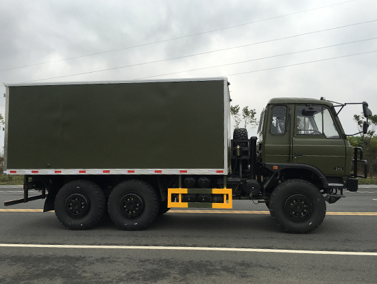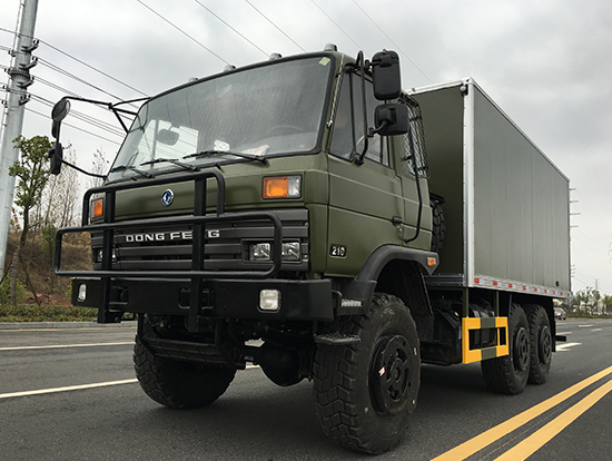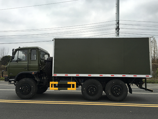 東風(fēng)六驅(qū)越野廂式車采用東風(fēng)越野卡車底盤DFS5160GLJ2 ,東風(fēng)153平頭一排半駕駛室,6*6驅(qū)動,康明斯210馬力,韶齒6檔變速箱,斷氣彈簧制動,貫通式中后驅(qū)動橋,12.5R20越野胎,軸距 3500+1250mm,加厚雙層大梁,帶軍用保險杠。六驅(qū)越野廂式車,廂體根據(jù)用戶需要形式多樣,選裝多樣,可以選裝空調(diào)、側(cè)門、側(cè)窗、發(fā)電機、裙邊結(jié)構(gòu)等.