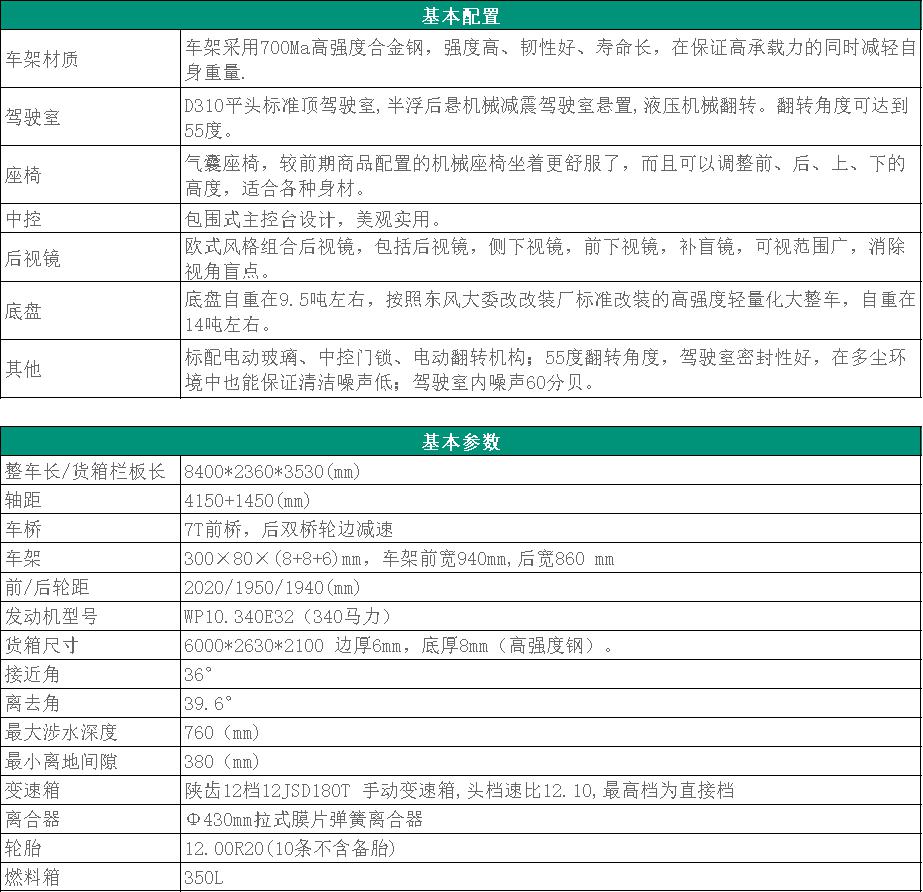 相關(guān)車型東風(fēng)大力神KC六驅(qū)自卸車配置參數(shù):DFL3251KC型六驅(qū)大力神自卸車,采用天龍大力神KC駕駛室,三段式保險杠,液壓翻轉(zhuǎn),帶原廠空調(diào),濰柴國三WP12.340型340馬力發(fā)動機,法士特十二檔變速箱,軸距4500+1400mm,株齒分動箱,北奔9噸前驅(qū)動橋,選裝13/16噸輪減中后橋,輪減、差速鎖,大梁300mm自卸專用梁,輪胎12.00R20鋼絲胎10+1條,5.6米-6米自卸貨箱,車廂采用邊10底12mm鋼板,加裝淋水器。