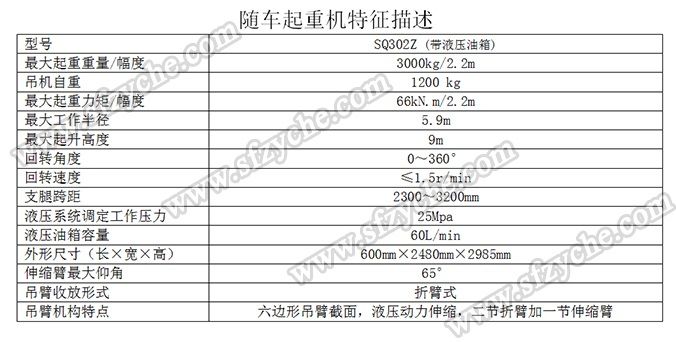 凈功率206kw; 起重機(jī)型號為:SQ302Z(帶液壓油箱),起重機(jī)質(zhì)量為:1200kg,最大額定超升載荷為:3000kg. 側(cè)防護(hù)金屬材料Q235斷面槽形,螺栓連接,斷面高度40mm,離地高度450mm; 后防護(hù)金屬材料Q235斷面槽形,螺栓連接,斷面高度135mm,離地高度500mm; 安裝具有衛(wèi)星定位功能行駛記錄儀,東風(fēng)越野隨車吊:m.mediamorfosisblog.com 吊機(jī)詳細(xì)參數(shù):