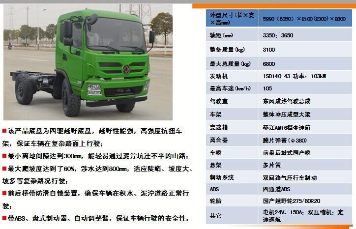 相關(guān)車型EQ2070GZ4DJ越野四驅(qū)底盤的詳細(xì)描述:該產(chǎn)品底盤為四驅(qū)越野底盤,越野性能強(qiáng),高強(qiáng)度抗扭車架,保證車輛在復(fù)雜路面上行駛時(shí),不會(huì)出現(xiàn)大梁斷裂等情況;最小離地間隙達(dá)到300mm,能輕易通過泥濘坑洼不平的山路;最大爬坡度達(dá)到了60%,適應(yīng)陡峭、坡度大、坡多等復(fù)雜路況行駛。前后橋帶防滑自鎖裝置,確保車輛在積水、泥濘道路正常行駛;帶ABS、盤式制動(dòng)器、自動(dòng)調(diào)整臂,保證車輛行駛的安全性。
