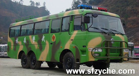 東風(fēng)六驅(qū)越野客車采用康明斯160馬力發(fā)動機,東風(fēng)5擋變速箱,整車長8.4米,寬2.35米,高2930米,采用東風(fēng)EQ6840東風(fēng)特汽越野車專用底盤,最多座位數(shù)30座,采用11R18大花紋越野輪胎,整車迷彩色,選裝空調(diào)暖風(fēng)系統(tǒng)。